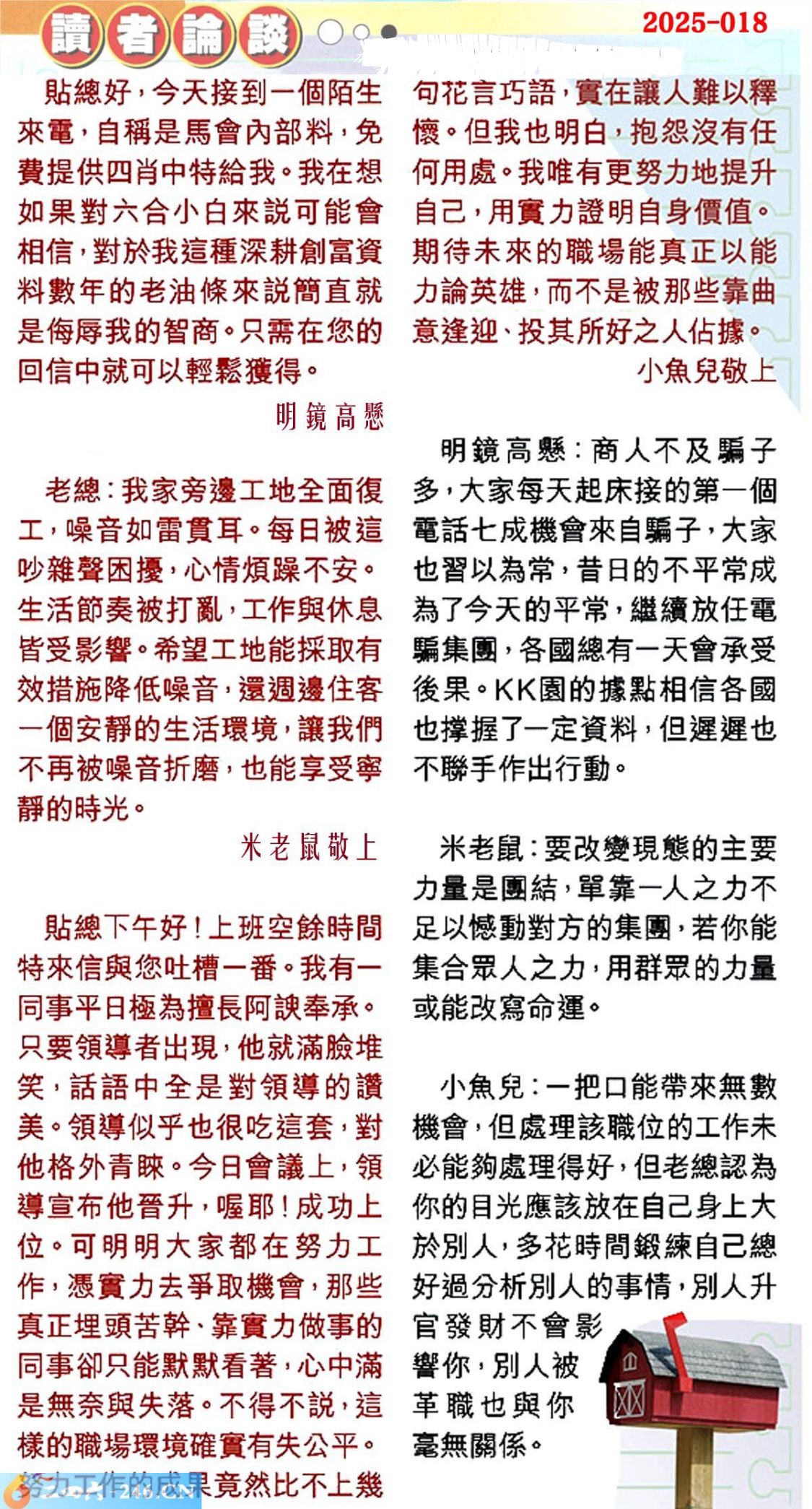 【3】.貼總下午好!上班空餘時間特來信與您吐槽一番。我有一同事平日極為擅長阿諛奉承。只要領導者出現,他就滿臉堆笑,話語中全是對領導的讚美。領導似乎也很吃這套,對他格外青睐。今日會議上,領導宣布他晉升,喔耶!成功上位。可明明大家都在努力工作,憑實力去爭取機會,那些真正埋頭苦幹、靠實力做事的同事卻只能默默看著,心中滿是無奈與失落。不得不說,這樣的職場環境確實有失公平。努力工作的成果竟然比不上幾句花言巧語,實在讓人難以釋懷。但我也明白,抱怨沒有任何用處。我唯有更努力地提升自己,用實力證明自身價值。期待未來的職場能真正以能力論英雄,而不是被那些靠曲意逢迎、投其所好之人佔據。小魚兒敬上