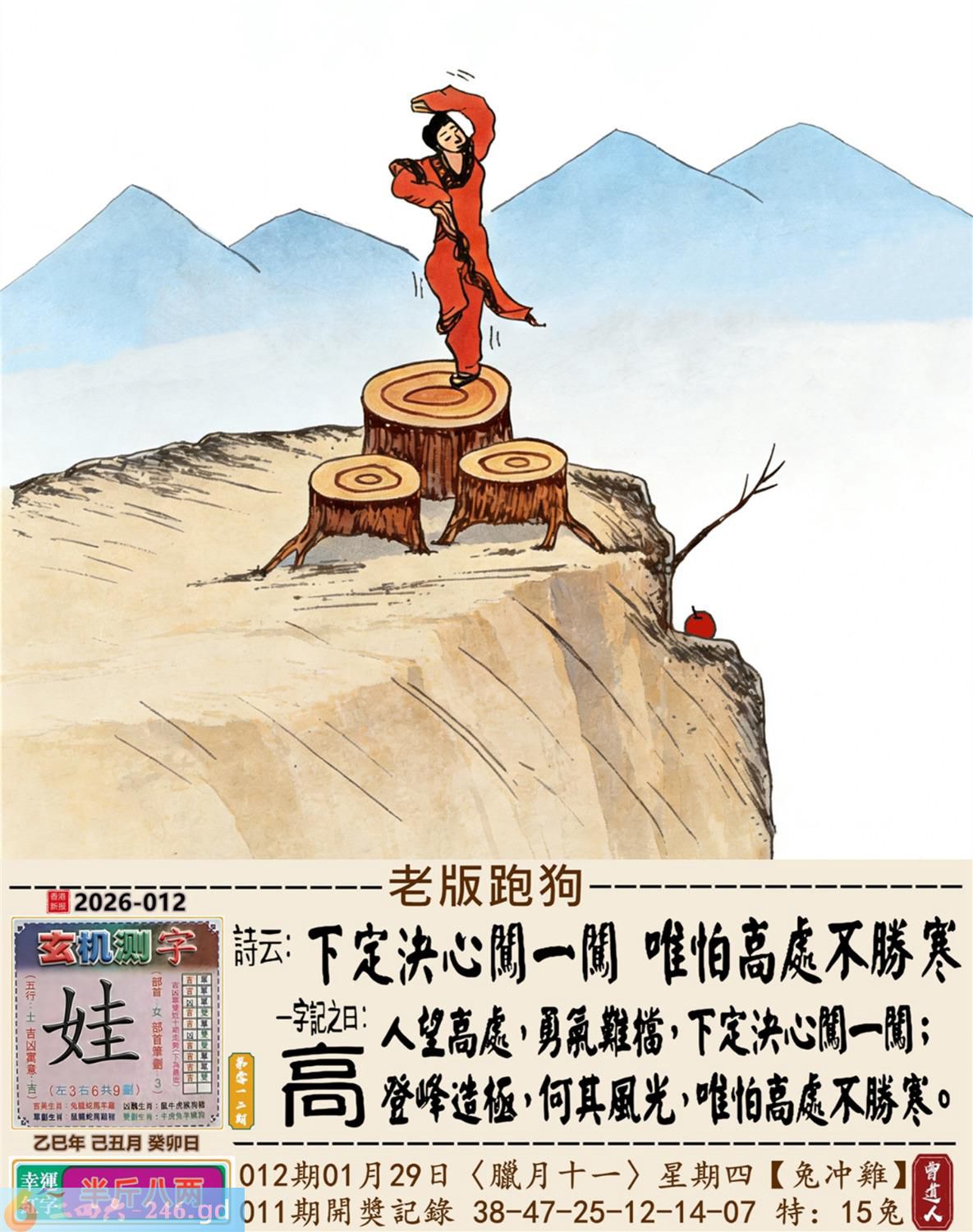 本帖最后由小歪于2026-1-2908:41编辑 2026年1月29日012期鸡(丁酉)(金箔金) 012期:老版跑狗玄機一字記之曰:【高】 詩云:下定決心闖一闖唯怕高處不勝寒 人望高處,勇氣難檔,下定決心闖一闖; 登峰造極,何其風光,唯怕高處不勝寒。 玄機測字:《娃》 密圖詩:竹藍打水一場空 《記》:八仙賀喜到門前 特碼大小單雙句:天天去市場買菜 今期必中:馬超 012期:特碼歇后語 祖奶奶的花鞋-----老式样 012期正版四字梅花诗:三天打鱼。 012期火车头:烧伤马。诗:马死兔伤,二九出特今期来。 012期香港第一手欲钱料:日本? 012期曾道人说:“三个?” 012期另版四字梅花诗:美丽神话。 012期香港第一手欲钱料:欲钱找2005年最后一期的开奖记录。 012期曾道人说:“恭贺大陆各位彩民在2005年的最后一期发大财”? 012期:二字經:多情 012期:二流子是特码 012期:智力金壤;左道旁门 012期:信箱紅字:【一錘定音】 012期:【暗碼:13-28-34-41】 012期:一語中特:【三頭六臂】 發財玄機圖:聞嗅探索警覺性強圖中明鼠紅藍 012期:藏寳圖 新:家在画桥堤下住 老:古来惟有酒偏香 禁:猴禁:9尾玄機字《读》 2026年012期【生活幽默】版 〖一個專養乳牛的牧場〗 一個專養乳牛的牧場,爲了維持牧場内牛衹的数量,在母牛群中放養了一衹公的乳牛。但是時間久了,這衹公牛也老了,開始有點力不從心,于是牧場的主人又買了一衹新的公牛來擔任維持牛衹數量的工作。至于那衹老公牛,由于過去数年來,它没有功勞也有苦勞,所以主人還是繼續放它在母牛群裹逍遥。有一天,主人去巡視牧場,看見老公牛氣喘嘘地趴在草地上。牧場主人走近説:你年紀大了就收斂一點,不要作這多。老公牛一臉無辜的説:你難道不能告訴那衹新來的,我不是母牛!