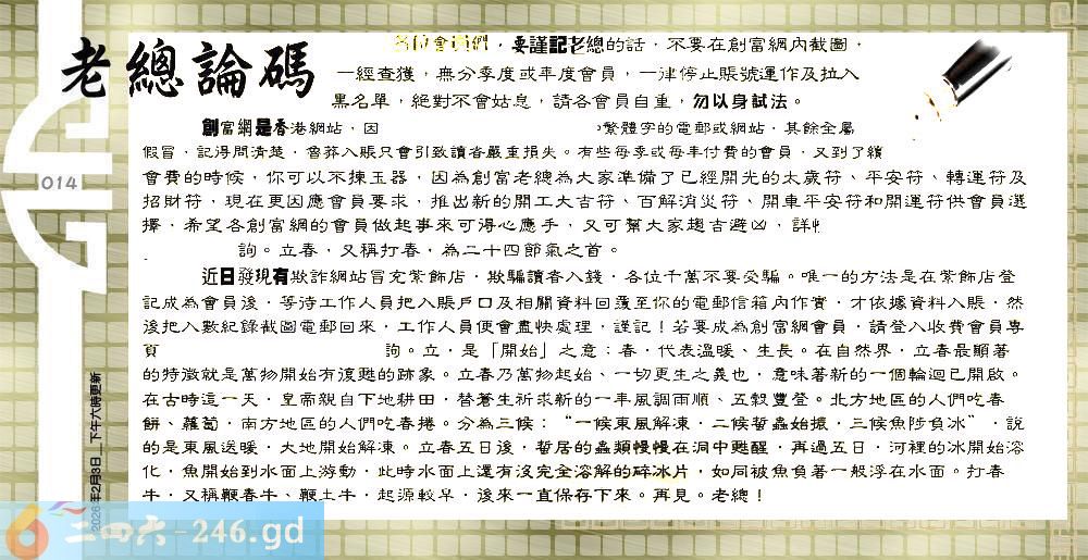 014期:六合皇金句/老总论码/萧公子/林大师/五行夺码/老总信箱截图