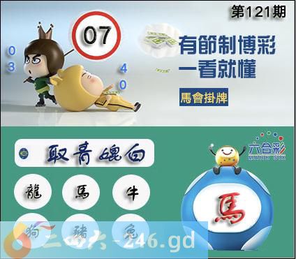 121期正版彩图挂:07 爆:马 挂牌成语:取青媲白 挂牌出肖:龙马牛狗猪兔