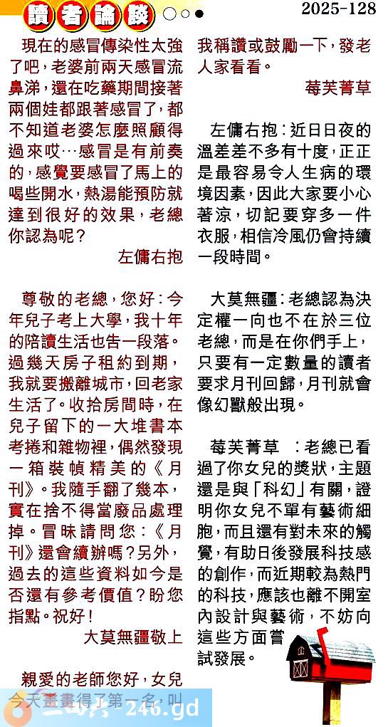 第一二八期讀者論談 1.現在的感冒傳染性太強了吧,老婆前兩天感冒流鼻涕,還在吃藥期間接著兩個娃都跟著感冒了,都不知道老婆怎麼照顧得過來哎...感冒是有前奏的,感覺要感冒了馬上的喝些開水,熱湯能預防就達到很好的效果,老總你認為呢?左傭右抱 〖左傭右抱〗:近日日夜的溫差差不多有十度,正正是最容易令人生病的環境因素,因此大家要小心著凉,切記要穿多一件衣服,相信冷風仍會持續一段時間。 2.尊敬的老總,您好:今年兒子考上大學,我十年的陪讀生活也告一段落。過幾天房子租約到期,我就要搬離城市,回老家生活了。收拾房間時,在兒子留下的一大堆書本考捲和雜物裡,偶然發現一箱裝幀精美的《月刊》。我隨手翻了幾本,實在捨不得當廢品處理掉。冒昧請問您:《月月刊》還會續辦嗎?另外,過去的這些資料如今是否還有參考價值?盼您指點。祝好!大莫無疆敬上 〖大莫無疆〗:老總認為決定權一向也不在於三位老總,而是在你們手上,只要有一定數量的讀者要求月刊回歸,月刊就會像幻獸般出現。 3.親愛的老師您好,女兒今天畫畫得了第一名,叫我稱讃或鼓勵一下,發老人家看看。莓芙菁草 〖莓芙菁草〗:老總已看過了你女兒的獎狀,主題還是與「科幻」有關,證明你女兒不單有藝術細胞,而且還有對未來的觸覺,有助日後發展科技感的創作,而近期較為熱門的科技,應該也離不開室內設計與藝術,不妨向這些方面嘗試發展。