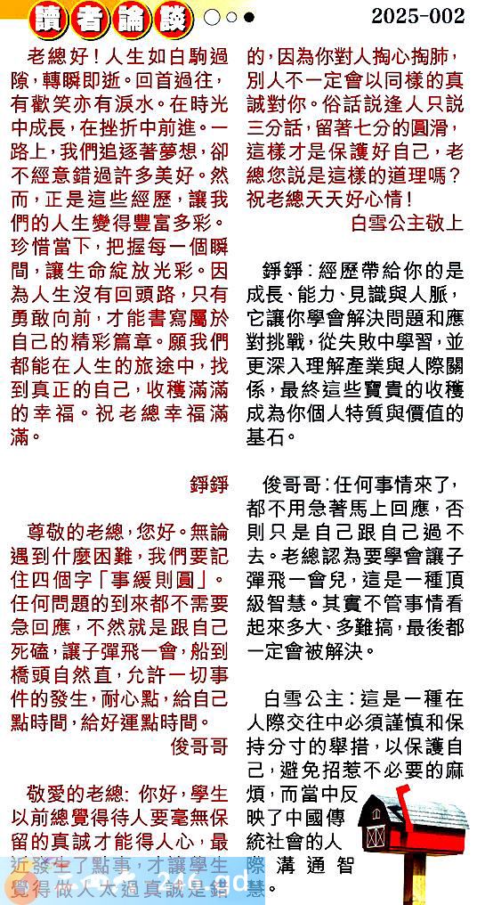 第002期讀者論談 1.老總好!人生如白駒過隙,轉瞬即逝。回首過往,有歡笑亦有淚水。在時光中成長,在挫折中前進。一路上,我們追逐著萝想,卻不經意錯過許多美好。然而,正是這些經歷,讓我們的人生變得豐富多彩。珍惜當下,把握每一個瞬間,讓生命綻放光彩。因為人生沒有回頭路,只有勇敢向前,才能書寫屬於自己的精彩篇章・願我們都能在人生的旅途中,找到真正的自己,收穫滿滿的幸福。祝老總幸福滿滿。錚錚 〖錚錚〗:經歴带給你的是成長、能力、見識與人脈,它讓你學會解決問題和應對挑戰,從失敗中學習,並更深入理解產業與人際關係,最終這些寶貴的收穫成為你個人特質與價值的基石。 2.尊敬的老總,您好。無論遇到什麼困難,我們要記住四個字「事緩則圓」。任何問題的到來都不需要急回應,不然就是跟自己死磕,讓子彈飛一會,船到橋頭自然直,允許一切事件的發生,耐心點,給自己點時間,給好運點時間。俊哥哥 〖俊哥哥〗:任何事情來了,都不用急著馬上回應,否則只是自己跟自己過不去・老總認為要學會讓子彈飛一會兒,這是一種頂級智慧。其實不管事情青看都起來多大、多難搞,最後一定會被解決。 3.敬愛的老總:你好,學生以前總覺得待人要毫無保留的真誠才能得人心,最近發生了點事,才讓學生覺得做人太過真誠是錯的,因為你對人掏心掏肺,別人不一定會以同樣的真誠對你。俗話説逢人只説三分話,留著七分的圓滑,這樣才是保護好自己,老總您説是這樣的道理嗎?祝老總天天好心情!白雪公主敬上 〖白雪公主〗:這是一種在人際交往中必須謹慎和保持分寸的舉措,以保護自己,避免招惹不必要的麻煩,而當中反映了中國傅西統社會的人際溝通智慧。