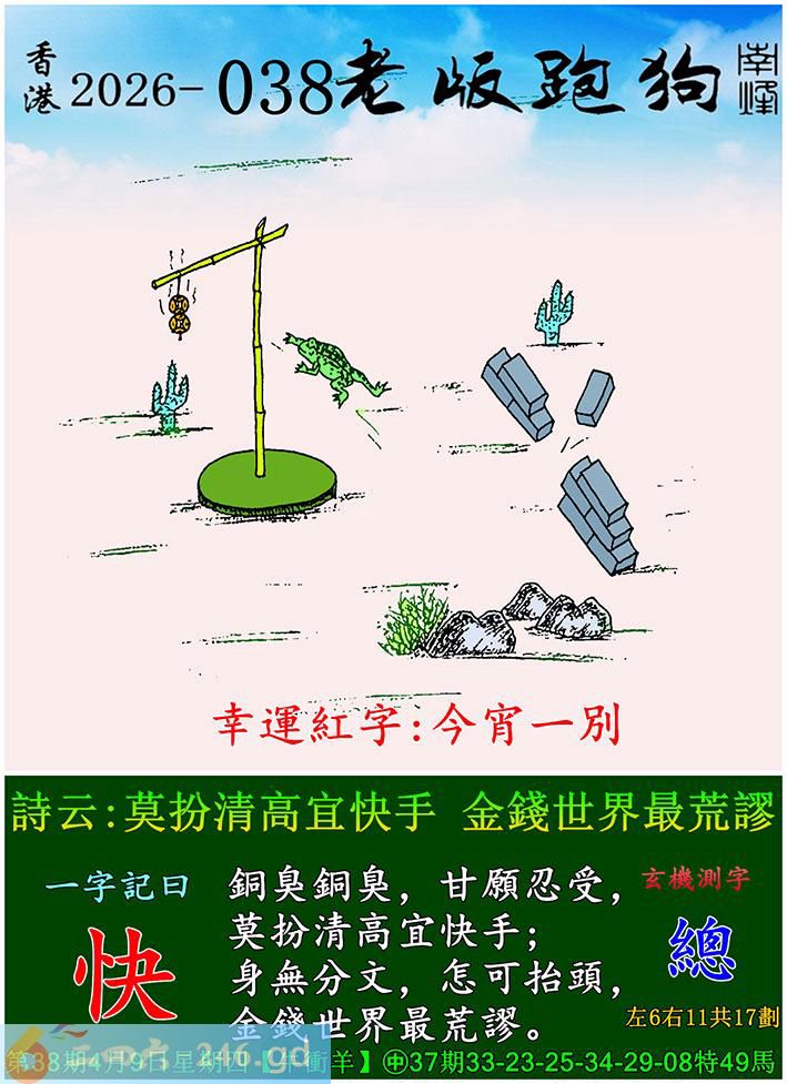 038期老版跑狗一字記之曰:【快】 詩雲:莫扮清高宜快手,金錢世界最最荒謬。 銅臭銅臭,甘願忍受,莫扮清高宜快手; 身無分文,怎可抬頭,金錢世界最最荒謬。 玄機測字:《總》