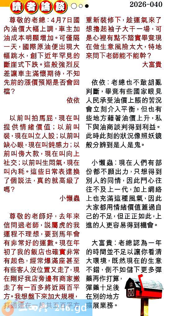第040期讀者論談 1.尊敬的老總:4月7日國內油價大幅上調,車主加油成本明顯增加。可僅隔一天,國際原油便出現大幅跳水,創下近年罕見的斷崖式下跌。這般強烈反差讓車主滿懷期待,不知先前的漲價預期是否會回檔?依依 〖依依〗:老總也不敢胡亂判斷,畢竟有些國家眼見人民承受油價上脹的苦況會立刻介入平衡,但也有些地方藉著油價上升,私下與油商談判得到利益。此時此刻的狀況像照妖鏡般分辨到是人是鬼 2.以前叫拍馬屁,現在叫提供情緒價值;以前叫装,現在叫立人設;以前叫缺心眼,現在叫鈍感力;以前叫傍大款,現在叫向上社交;以前叫生悶氣,現在叫內耗。這些日常表達換了個説法,真的就高級了嗎?小懒蟲 〖小懶蟲〗:現在人們有部份都不願出力,只想得到别人的同情,因此鬥心往往不及上一代,加上網絡上也充滿這種風氣,因此大家都用情緒價值蓋過自己的不足,但正正如此,上進的人更容易得到機會。 3.尊敬的老師好,去年來信問過老師,説屬虎的我運程不理想,要到馬年會有非常好的運數。現在年初了我的飯店也確實非常有起色,經常爆滿座甚至有些客人沒位置又走了,現在剛好我店旁邊有商家搬走了有一百多將近兩百平方。我想盤下來加大規模,打通連在一起共五百平方重新裝修下,趁運氣來了想撸起袖子大干一場,可是心裡有點不踏實畢竟現在做生意風險太大,特地來問下老師能不能幹?大富貴 〖大富貴〗:老總認為一年的時間並不足以讓你看清大環境,既然現在的生意不錯,倒不如儲下更多彈藥再作打算,彈藥十足後在別的地方擴展業務。
