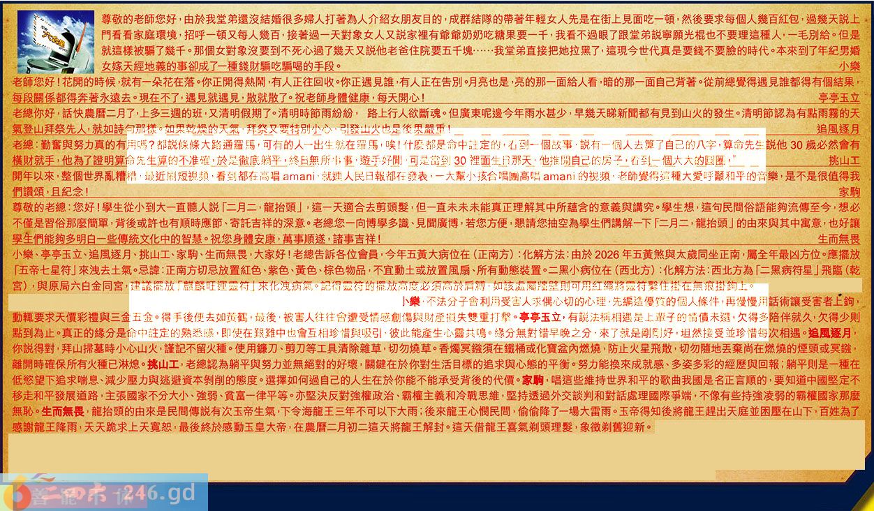 【6】.尊敬的老總:您好!學生從小到大一直聽人説「二月二,龍抬頭」,這一天適合去剪頭髪,但一直未未未能真正理解其中所蕴舍的意義與講究。學生想,這句民間俗語能夠流傅至今,想必不僅是習俗那麼簡單,背後或許也有順時應節、寄託吉祥的深意。老總您一向博學多識、見聞廣博,若您方便,懇請您抽空為學生們講解一下「月二,龍抬頭」的由來與其中寓意,也好讓學生們能夠多明白一些傳統文化中的智慧。祝您身體安康,萬事順遂,諸事吉祥!生而無畏