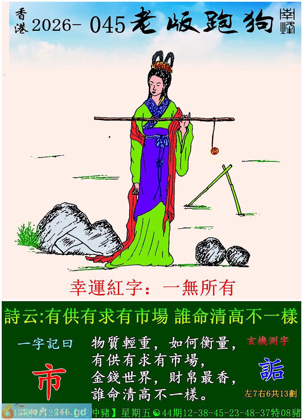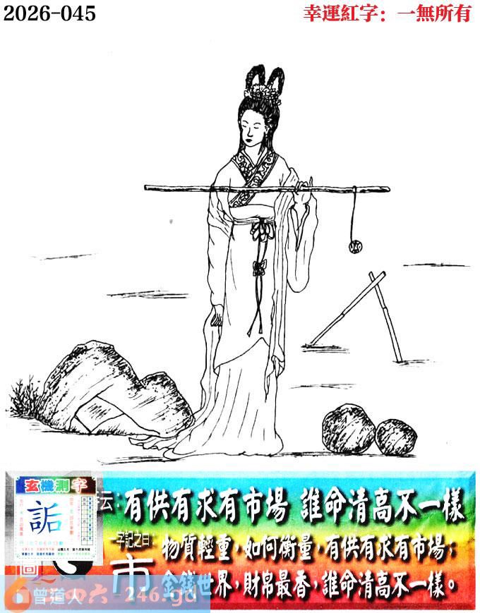 045期老版跑狗一字記之曰:【市】 詩雲:有供有求有市場,誰命清高不一樣。 物質輕重,如何衡量,有供有求有市場; 金錢世界,財帛最香,誰命清高不一樣。 玄機測字:《詬》