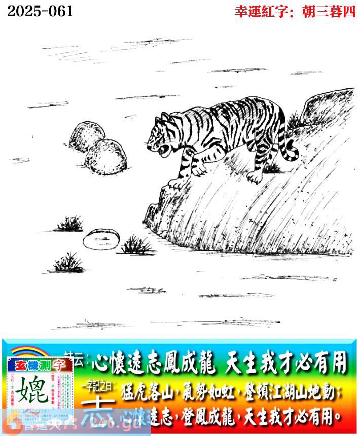 本帖最后由期望于2025-6-205:30编辑 61期兔该来了 061期老版跑狗一字記之曰:【志】 詩雲:心懷遠志鳳成龍,天生我才必有用。 猛虎落山,氣勢如虹,整頓江湖山地動; 心懷遠志,登鳳成龍,天生我才必有用。 玄機測字:《媲》