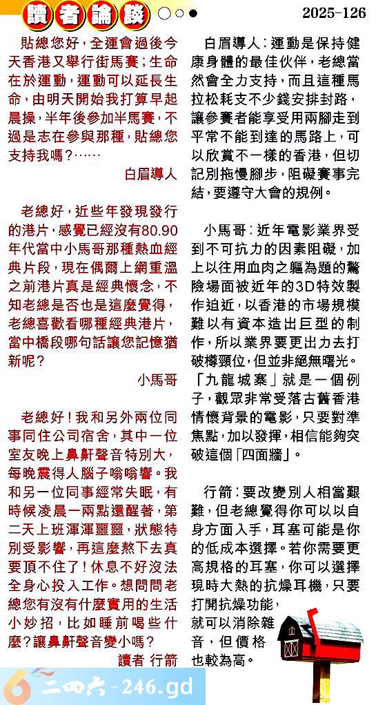 第一二六期讀者論談 1.貼總您好,全運會過後今天香港又舉行街馬賽;生命在於運動,運動可以延長生命,由明天開始我打算早起晨操,半年後參加半馬賽,不過是志在參與那種,貼總您支持我嗎?......白眉導人 〖白眉導人〗:運動是保持健康身體的最佳伙伴,老總當然會全力支持,而且這種馬拉松耗支不少錢安排封路,讓參赛者能享受用兩腳走到平常不能到達的馬路上,可以欣賞不一樣的香港,但切記別拖慢腳步,阻礙赛事完結,要遵守大會的規例。 2.老總好,近些年發現發行的港片,感覺已經沒有80.90年代當中小馬哥那種熱血經典片段,現在偶爾上網重溫之前港片真是經典懷念,不知老總是否也是這麼覺得,老總喜歡看哪種經典港片,當中橋段哪句話讓您記憶猶新呢?小馬哥 〖小馬哥〗:近年電影業界受到不可抗力的因素阻礙,加:上以往用血肉之軀為題的驚險場面被近年的3特效製作迫近,以香港的市場規模難以有資本造出巨型的制作,所以業界要更出力去打破樽頸位,但並非絕無曙光。「九龍堿寨」就是一個例子,觀眾非常受落古舊香港情懷背景的電影,只要對準焦點,加以發揮,相信能夠突破這個「四面牆」。 3.老總好!我和另外兩位同事同住公司宿舍,其中一位室友晚上鼻鼾聲音特別大,每晚震得人腦子嗡嗡響。我和另一位同事經常失眠,有時候凌晨一兩點還醒著,第二天上班渾渾噩噩,狀態特別受影響,再這麼熬下去真要頂不住了!休息不好沒法全身心投入工作。想問問老總您有沒有什麼實用的生活小妙招,比如睡前喝些什麼?讓鼻鼾聲音變小嗎?讀者行箭 〖行箭〗:要改變別人相當艱難,但老總覺得你可以以自身方面入手,耳塞可能是你的低成本選擇。若你需要更高規格的耳塞,你可以選擇現時大熱的抗燥耳機,只要打開抗燥功能,就可以消除雜音,但價格也較為高。