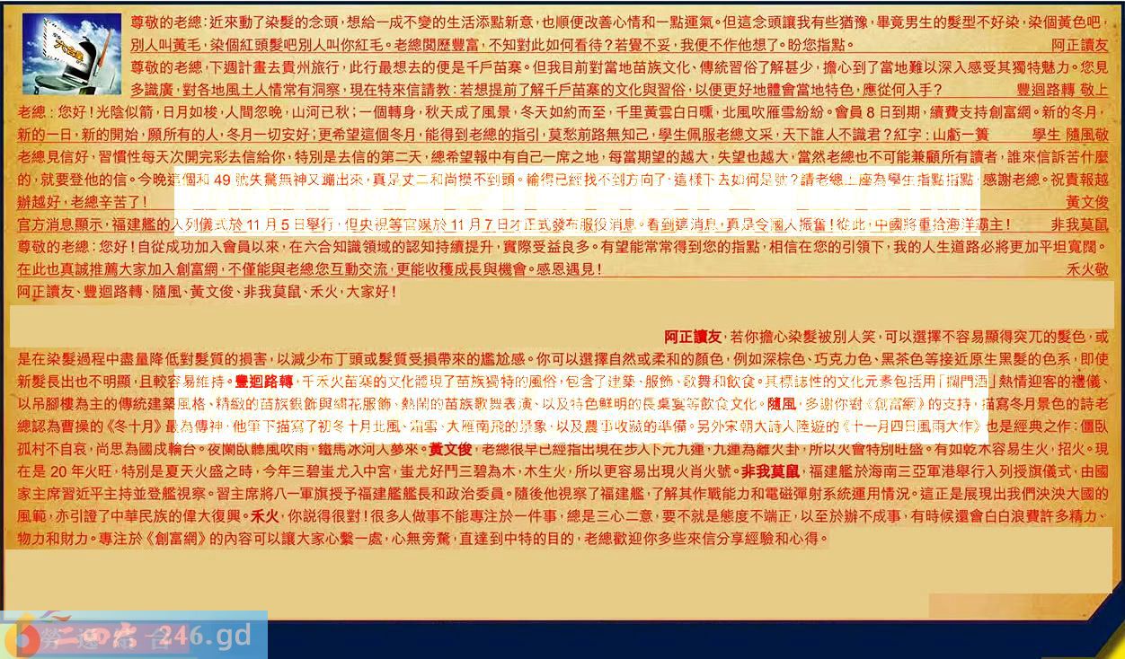 【4】.老總見信好,習慣性每天次開完彩去信給你:特別是去信的第二天,總希望報中有自己席之地,每當期望的越大,失望也越大,當然老總也不可能兼顧所有讀者,誰來信訴苦什麼的,就要登他的信。今晚這個和49號失驚無神又蹦出來,真是丈二和尚摸不到頭。輪得已經找不到方向了,這樣下去如何是號?請老總上座為學生指點指點,感謝老總。祝貴報越辦越好,老總辛苦了!黄文俊