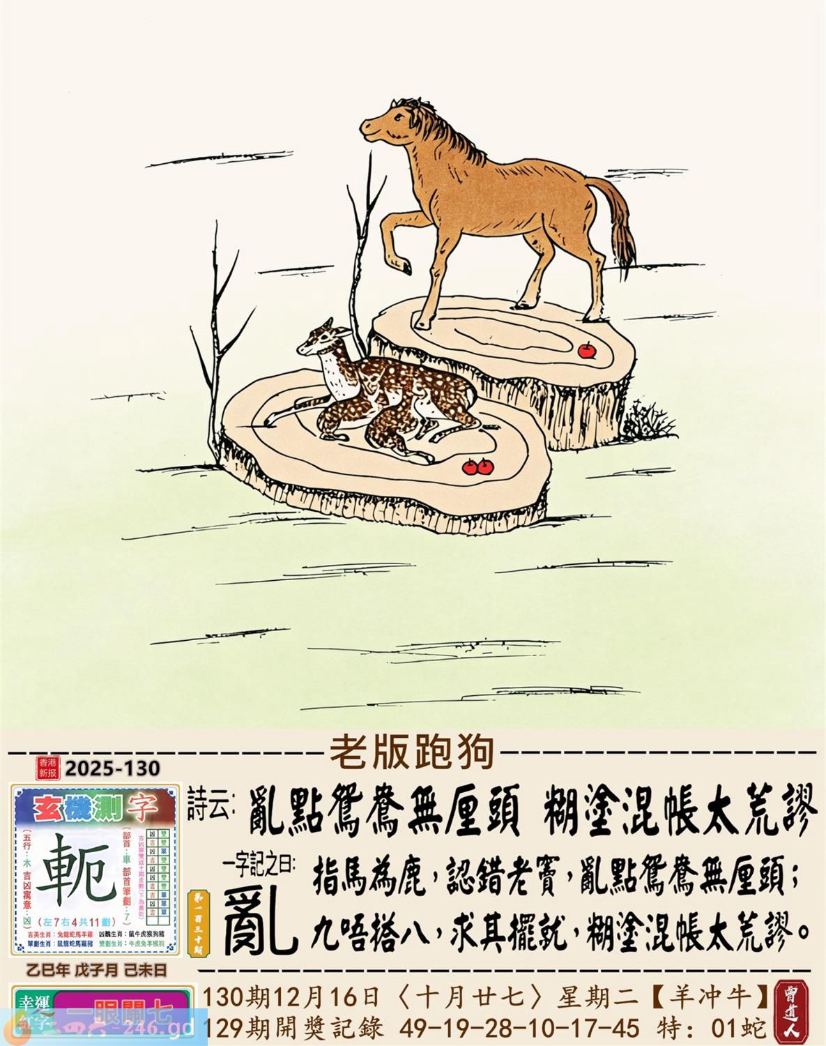 2025年12月16日130期牛(癸丑)(天上火) 130期:老版跑狗玄機一字記之曰:【亂】 詩云:亂點鴛鴦無厘頭糊塗混帳太荒謬 日指馬鹿,認錯老竇,亂點鴛鴦無厘頭; 九唔搭八,求其擺就,糊塗混帳太荒謬。 玄機測字:《軛》 密圖詩:一把石頭抛水中 《記》:人生一雙八字眼 特碼大小單雙句:姑娘十八一朵花 今期必中:曹操 130期:特碼歇后語 脑门上开口-----对天说话 130期正版四字梅花诗:胸有成竹。 130期火车头:烧伤龙。诗:龙死马伤,看好三九梦中游。 130期香港第一手欲钱料:一? 130期曾道人说:“牛?” 130期另版四字梅花诗:有苦难言。 130期香港第一手欲钱料:欲钱看西部大开发。 130期曾道人说:“男人三十好动被象征为什么”? 130期:二字經:小氣 130期:中药是特码 130期:智力金壤:四面楚歌 130期:信箱紅字:【吹唇唱吼】 130期:【暗碼:15-21-46-49】 130期:一語中特:【三言兩語】 發財玄機圖:活力敏捷貼心好動圖中明狗藍綠 130期:藏寳圖 新:最是城中闲静处 老:料峭轻寒结晚阴 禁:狗禁:0尾玄机字《贾》 2025年130期【生活幽默】版 〖觀念一致〗 老處女與花花公子聊天,偏偏觀念始終無法溝通。 花花公子耐心地問:"好,我再問你一個問題,當你進到一間有兩張床的房間裏,一張床上躺了一個女人,一張床上躺了一個男人,你會躺哪張床?"老處女不加思索答:"當然是躺女人的那張床!"花花公子得意地説:"你看,我就説我們的觀念總會一致的嘛!"